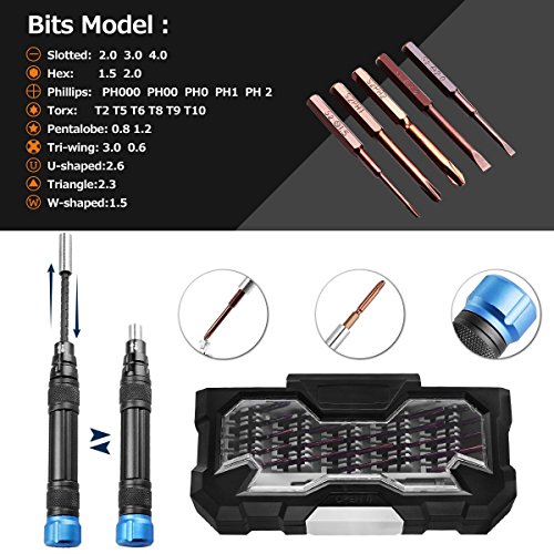 ▲Mini bit magnetici - Questo set di cacciaviti include scanalature, esagono incassato, croce, torx, pentalobe, a tre ali, a forma di U, triangolo, a forma di W ( Intaglio: 2.0 3.0 4.0, esadecimale: 1.5 2.0, Phillips: PH000 PH00 PH0 PH1 PH 2, Torx: T2 T5 T6 T8 T9 T10, Pentalobe: 0.8 1.2, Tri-ala: 3.0 0.6, a forma di U: 2.6, Triangolo: 2.3, a forma di W: 1.5 )