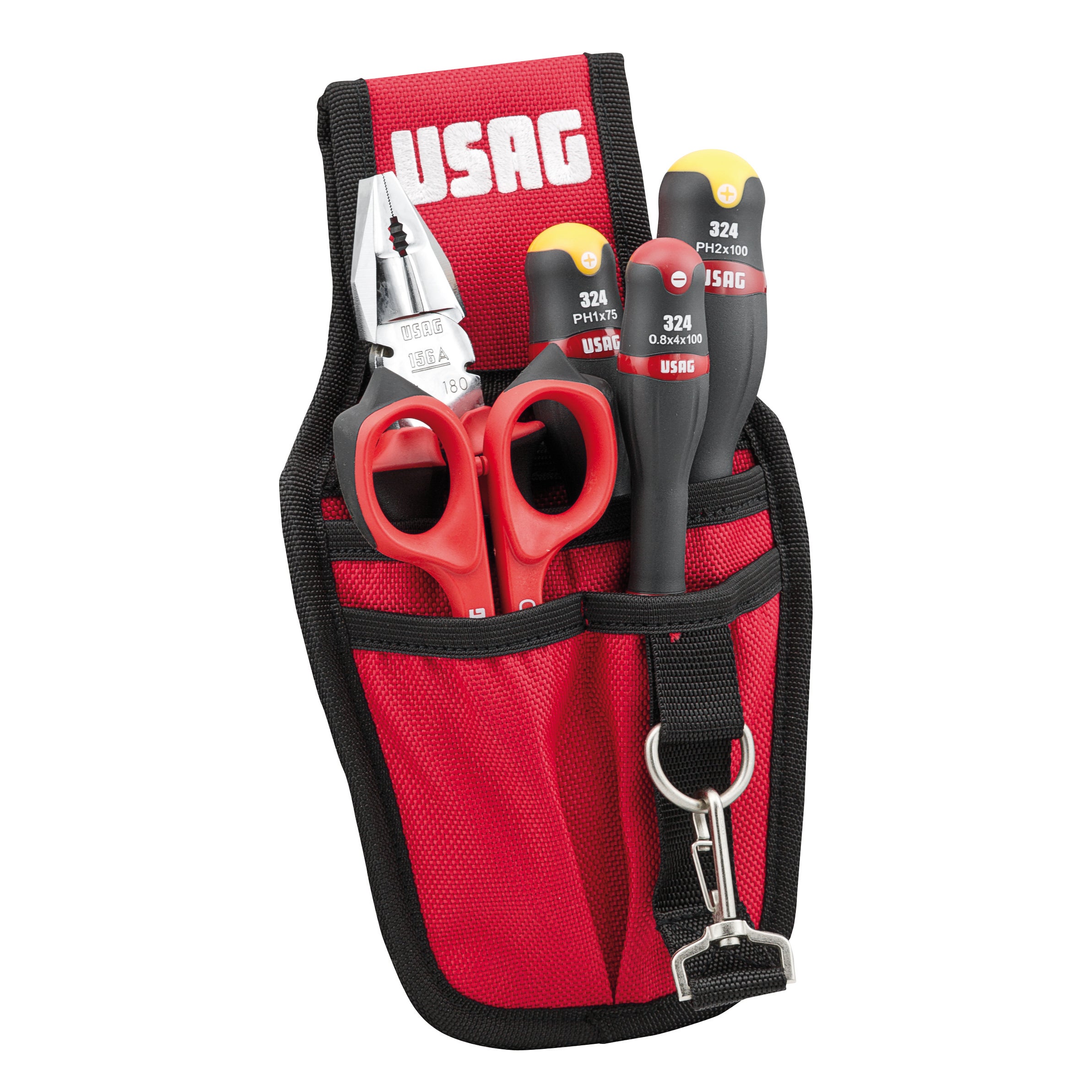 Attrezzature manuali in marsupio ad alta resistenza con sistema di fissaggio alla cintura a strappo, tasche elasticizzate e gancio porta nastro
