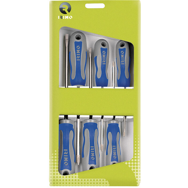 Set di 6 cacciaviti 2 piatti, 2 dritti, 2ph in scatola di cartone 459-6-c irimo. comprende 6 cacciaviti a taglio e a croce. a taglio: 408-3-75 408-4-100 407-5,5-125 407-6,5-150. a croce: 409-1-100 409-2-125. punta lucida con sand per una migliore presa del cacciavite e garanzia totale contro la ruggine. impugnatura bi-componente per una presa confortevole e un elevato trasferimento della coppia. la forma dell'impugnatura impedisce all'utensile di rotolare. con foro di sospensione. albero in acciaio legato ad alte prestazioni, cromato e completamente temprato. lama contrassegnata in modo permanente con la misura e il numero di serie per una facile identificazione. in scatola di cartone.
