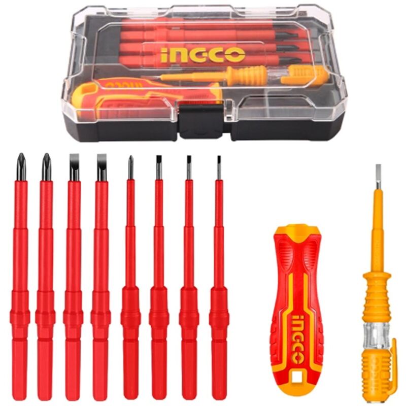 Include: 8 pz Attacco per cacciavite isolati (1000V): SL2.5x110mm SL3x110mm SL4x110mm SL5.5x110mm SL6.5x110mm PH0x110mm PH1x110mm PH2x110mm 1 manico isolato intercambiabile 1 cercafase da: 140mm (Tensione di prova: 100-500V CA) Imballato in valigetta