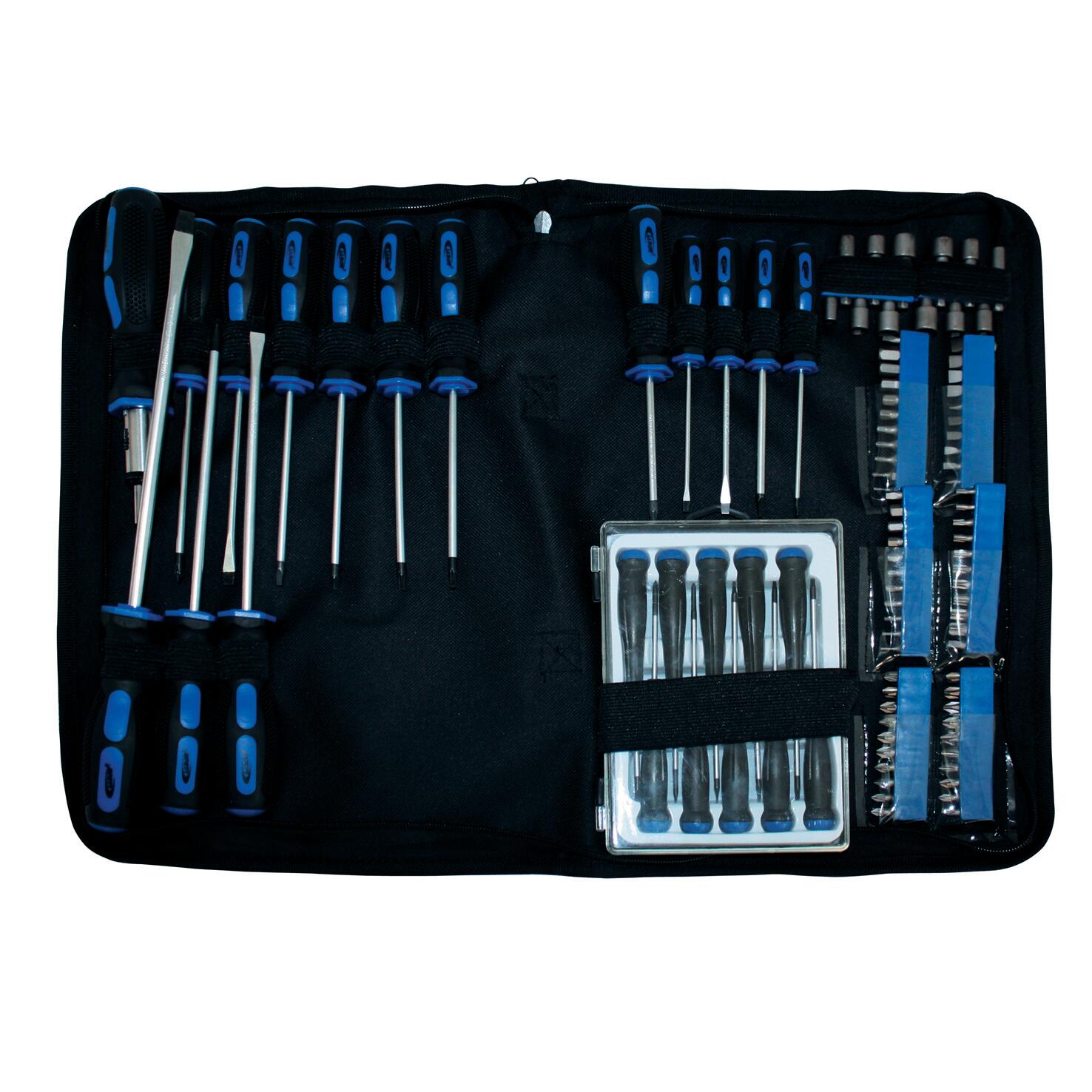 Lama in acciaio, composto da 14 cacciaviti, 10 cacciaviti di precisione, 63 inserti, 12 bussole, 1 cacciavite porta inserti 83 pezzi, manico in plastica