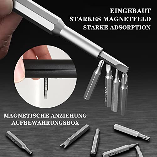 Impugnatura ergonomica magnetica antiscivolo: il manico magnetico è realizzato in lega di alluminio, un design antiscivolo con tappo girevole per una rotazione e un controllo precisi. Il design magnetico garantisce una registrazione stabile delle punte del cacciavite per evitare che le viti cadano e rimuovere facilmente.