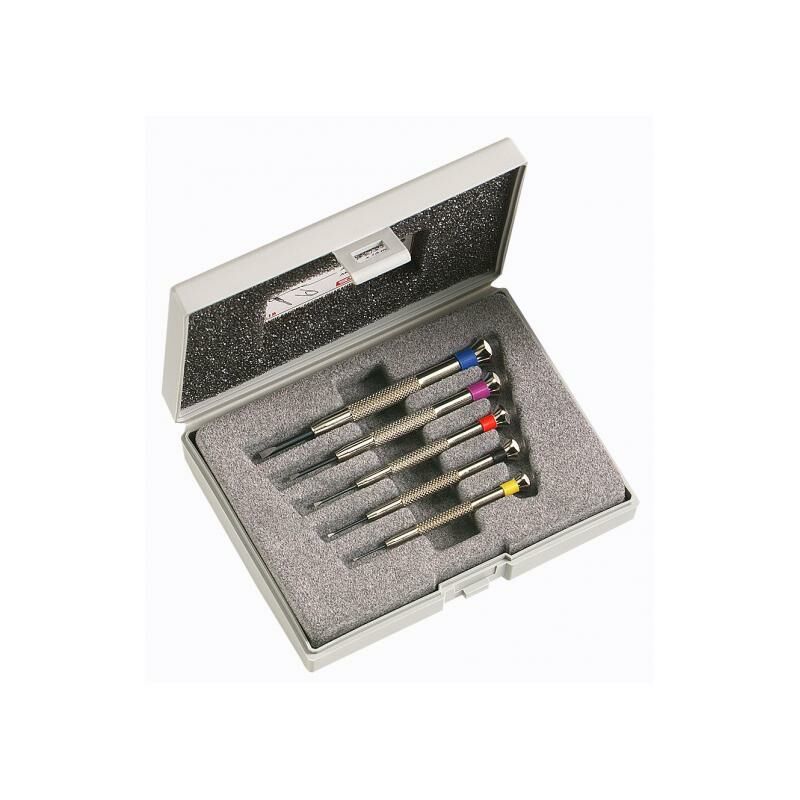 Dettagli: 5 cacciaviti per viti con intaglio: 0,8x13 - 1x16 - 1,2x17 - 1,6x19 - 2,5x21 mm. Presentazione: Lama cromata e brunita. In custodia di plastica. Peso: 130 g.