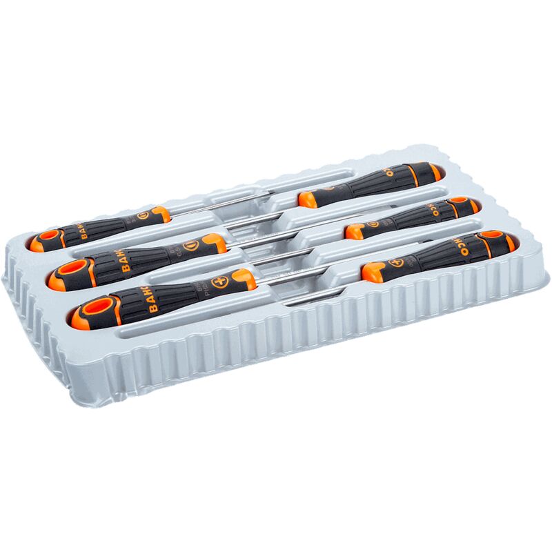 Bahco - Set di cacciaviti BahcoFit 6 pezzi con impugnatura in gomma - B219.006 - Contiene 6 cacciaviti - Viti con intaglio: 0,5 x 3,0 x 75, 0,8 x 4,0 x 100, 1 x 5,5 x 125, 1,2 x 6,5 x 125 mm - Phillips: PH1 x 100, PH2 x 125 mm - Punta rifinita al fosfato per una maggiore precisione - Impugnatura bi-materiale con scanalature verticali e ampia area di presa confortevole con elevato trasferimento di coppia - Simbolo indelebile e marcature sul manico per una rapida identificazione della punta - Foro di sospensione integrato - Lama in acciaio ad alte prestazioni con cromatura per un'elevata protezione dalla corrosione Strumento di lunga durata - Confezionato in una scatola di cartone - Comodo da usare grazie all'impugnatura bicomponente con oltre il 75% di gomma - Presa ottimale grazie alle scanalature verticali antiscivolo sul manico - Facile identificazione della dimensione e del tipo di vite grazie alle marcature incise nel manico Dati tecnici: Numero di cacciaviti: 6 Peso: 450 g