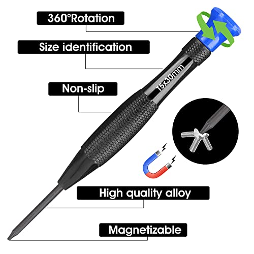 Prestazioni e design di qualità: tutti questi mini cacciaviti (Phillips Torx Star) hanno un giunto girevole con cuscinetti a sfera per un lavoro più veloce e resistenza allo scivolamento. La punta del cacciavite è magnetica, quindi le viti piccole non cadono (non valide per viti in acciaio inossidabile). Sono anche comodi da tenere e forniscono un buon controllo della coppia. Sono codificati a colori sul tappo, manico contrassegnato con dimensioni e lama della testa, che è molto facile distinguere diversi cacciaviti.