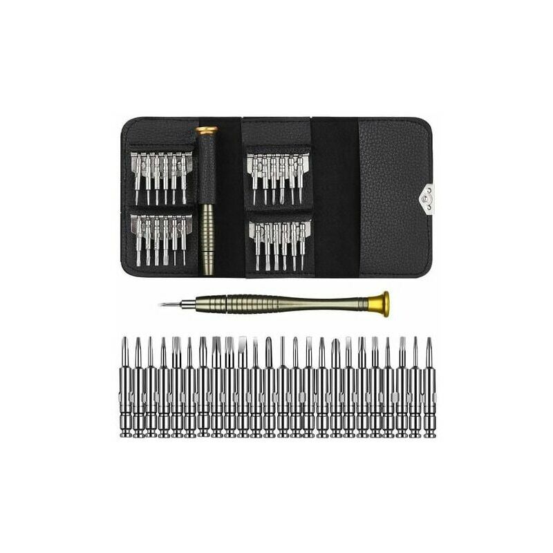 Il set multi-driver professionale di precisione 25 in 1 include: Pentalobe, Torx, Phillips, piccole viti per telefoni cellulari, riparazione occhi, riparazione occhiali, tablet PC/lettore Mp3, riparazione Macbook e hobbisti. Il set di cacciaviti di precisione in acciaio al cromo vanadio viene fornito con 1 custodia in pelle a scatto per tenere tutti gli strumenti al sicuro ed è abbastanza piccolo da poter essere portato con te ovunque o riposto ovunque. Grazie alla superficie scanalata e antiscivolo, il manico si adatta particolarmente bene alla mano e ti aiuta anche a fissare le viti da seduto. Facile da usare: il montaggio dei diversi inserti avviene svitando il corpo del cacciavite quindi posizionando la punta. Una volta in posizione, non si sposta più. Set di cacciaviti per tutti i piccoli lavori di riparazione in casa, gamma di PC, laptop ed elettronica: indispensabile per la meccanica fine di dispositivi elettronici, telefono portatile ecc. ideale per modellismo, bricolage, per