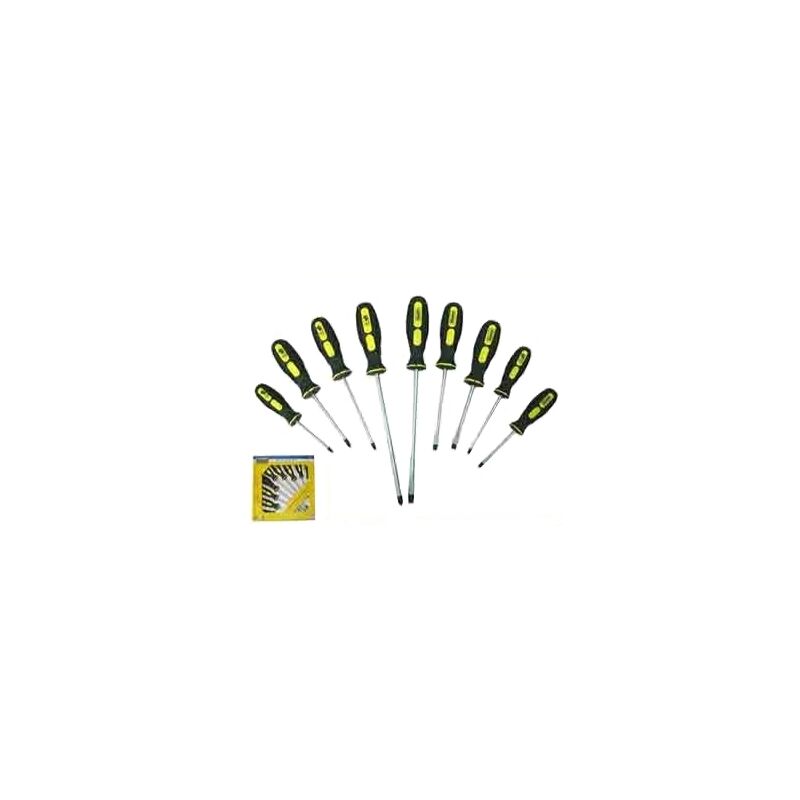 Set di 9 cacciaviti/giraviti con stele in acciaio cromo vanadio e impugnatura in bicomponente soft-grip. La confezione comprende: 5 cacciaviti flat 5 cacciaviti philips Certificazione GS/TUV