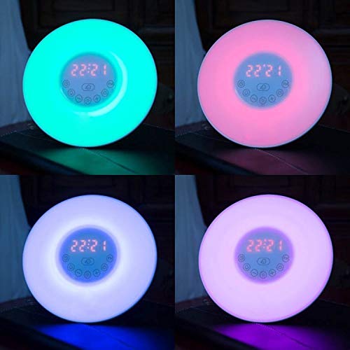 Cadrim - Lampada-sveglia, da comodino, simulazione alba, 6 allarmi con suoni naturali, 7 colori di luce, luce notturna a LED, orologio allarme Snooze e radio FM, controllo tattile e caricatore USB.