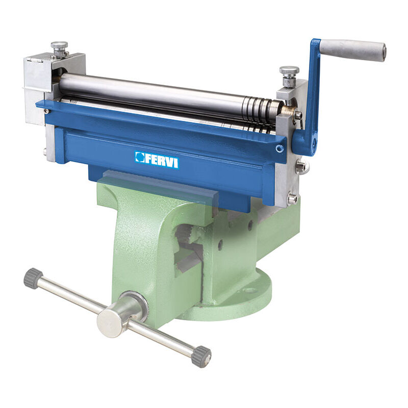 MINI CALANDRA FERVI 0235 ( MORSA NELLA FOTO NON INCLUSA ) Mini calandra a 3 rulli ad assi paralleli, con distanza regolabile per calandratura a freddo di lamiere metalliche. Scheda Tecnica: Lunghezza max: 300 mm Spessore max: 2,5 mm Diametro dei rulli: 30 mm Peso: 11 Kg