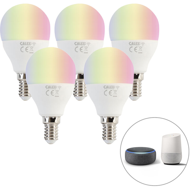 Calex Set di 5 lampade LED smart E14 RGBW P45 opaca 4,9W 470 lm 2200-4000K Aggiungi questo set di 5 lampadine LED intelligenti E14 ai tuoi interni e avrai sempre la luce giusta! Ogni lampadina ha un diametro di 4,5 cm ed è alta 9 cm. Questa lampadina consuma 4,9 watt, producendo 470 lumen e 2.200 - 4.000 Kelvin. In media, questa lampadina dura 15.000 ore. Vuoi creare un'atmosfera speciale? Questa lampadina è dimmerabile. Inoltre, questa lampadina è intelligente. Ciò significa che può essere controllata da remoto con lo smartphone o con il sistema di domotica. La lampadina ha anche una funzione RGB, il che significa che puoi regolare il colore della luce, ad esempio, su blu, giallo o rosso. Acquista subito questo set di 5 lampadine intelligenti per la tua casa! Funzioni extra: Regolabile: Dimmer escluso Lampadine inclusiva Il Calex Set di 5 lampade LED smart E14 RGBW P45 opaca 4,9W 470 lm 2200-4000K è Trasparente. Gli spazi abitativi adatti per questa lampada sono: Luci da interno.