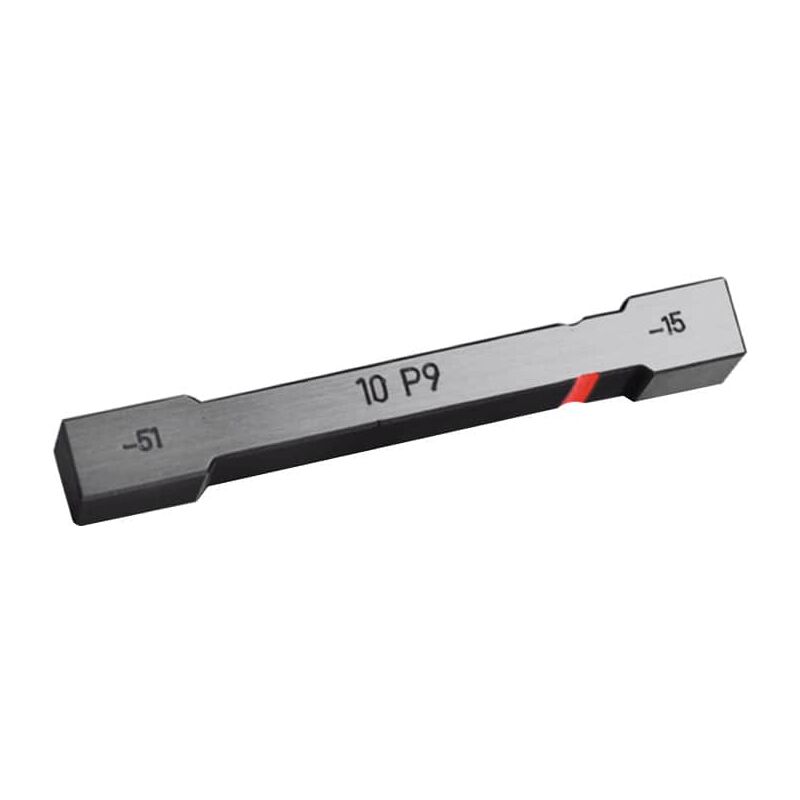 9 Calibri a tampone per controllo di scanalature e chiavette su alberi, dotati di lati passa/non passa. Lato passa con sovrametallo di usura a norma DIN 7164. Corpo del calibro in acciaio temprato. Calibri a tampone piatto per campi di tolleranza ISO A − ZC nei gradi di tolleranza base 7 − 13. Al momento dell'ordine indicare la dimensione nominale, il campo di tolleranza e il grado di tolleranza base o la classe di tolleranza necessari, per es. n. art. 484406 Dim. 10M6. Uso: Per controllare gli accoppiamenti tra piani paralleli, per es. di scanalature o chiavette. Norma: Toleranzen und Abmaße nach DIN EN ISO 1938-1 und DIN 7164. Nota: Definire la classe di tolleranza desiderata. Al momento dell'ordine indicare il campo di tolleranza (A − ZC) e il grado di tolleranza base (7 −