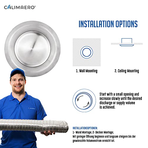 Funzione: la valvola a disco è universale e si adatta a tutti i comuni tubi di ventilazione rotondi e tubi flessibili secondo DIN EN 1506. Il telaio di montaggio è fissato con viti incluse nella confezione. La corrente di volume viene regolata dal piatto della valvola girevole. Per le esigenze domestiche basta iniziare con una piccola apertura e aumentare lentamente fino a raggiungere il volume desiderato.