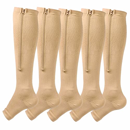 MTSS Calze a Compressione Medica con Punta Aperta, 23 - 32 mmHg, Firm Classe II, al Ginocchio Supporto Calze Senza Puntale, 5 Paia. Beige-S/M