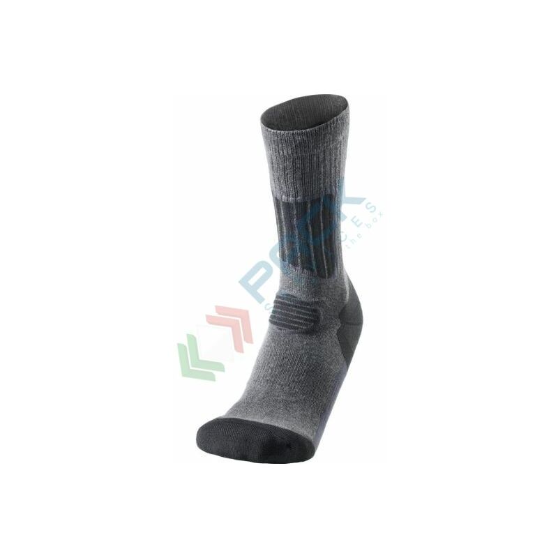 Calza tecnica realizzata in 70% cotone pettinato, 23% poliammide, 6% Cordura®, 1% elastan con polsino Anti-Stress e fascia elasticizzata stabilizzante alla caviglia e intorno al piede. Dispone di rinforzo protettivo anteriore sul collo del piede, posteriore sul tendine dAchille e laterale sul malleolo. Punta, tallone e stinco rinforzati in media densità. Plantare aerato e traspirante. La struttura della calza da lavoro è differenziata per piede Dx e per piede Sx. Calza antibatterica, anti odore, antistatica. Colore grigio/nero. Prodotto venduto a paia. Taglie disponibili 35/38 - 39/42 - 43/46 - 47/49