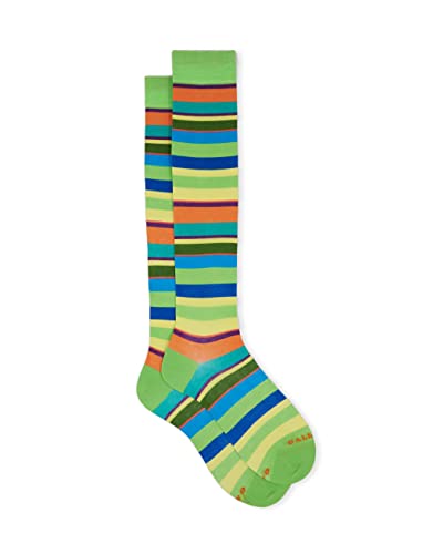 Calze lunghe da uomo realizzate in Italia in cotone leggerissimo elasticizzato, morbidissime al tatto e create per adattarsi perfettamente ad ogni tipo di look. L'iconica fantasia a righe multicolor sui toni del verde lime rende queste calze immediatamente riconoscibili. Il brand Gallo è ricamato in punta a contrasto.