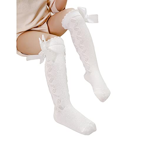 JEG - Calzini alti al ginocchio per neonati, in stile spagnolo, per neonati, caldi e invernali, in cotone a maglia con fiocco, Bianco sporco, Small