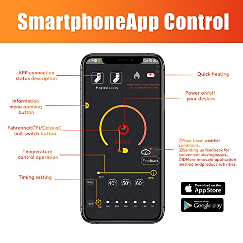 【Controllo tramite App Smartphone】 Le calze possono essere controllate tramite un'applicazione smartphone, consentendoti di regolare la temperatura, impostare un timer, aprirle/chiuderle o controllare singolarmente ciascuna calza con un semplice tocco delle dita. Non è più necessario piegarsi. L'applicazione è user-friendly, supporta molte lingue e non richiede registrazione: basta scaricarla seguendo le istruzioni. (Richiede l'attivazione del Bluetooth)