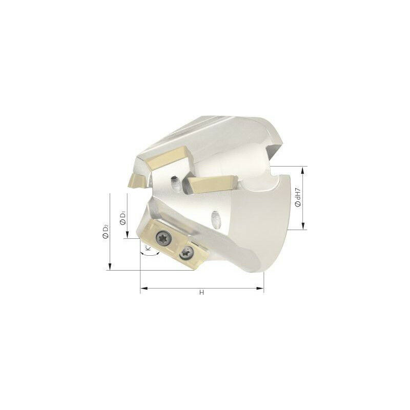 Fresa a smussare 15° Design: Fresa a smussare stabile. Garantisce un taglio fluido e a basse vibrazioni grazie alla forte geometria di taglio positiva. Portautensili nichelato. Consegna senza inserti indicizzabili. senza cacciavite. Applicazioni: Per la smussatura e la fresatura dei bordi. * Numero effettivo di denti per il calcolo dell'avanzamento.