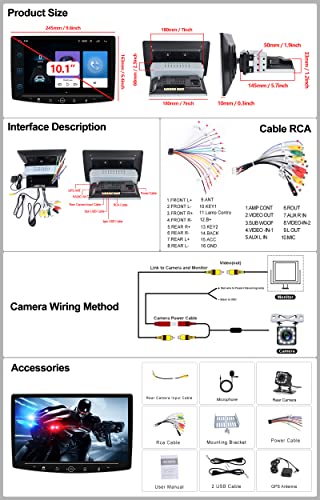 【Radio Android 1 DIN con schermo rimovibile】 Caratterizzata da un touch screen da 10,1 pollici ad alta risoluzione con regolazione dello schermo su/giù, sinistra/destra. Sistema Android 11, 1G RAM e 16G ROM. Supporta subwoofer esterno, OBD, DAB+, telecamera posteriore (inclusa), microfono (incluso) e DVR, ecc.
