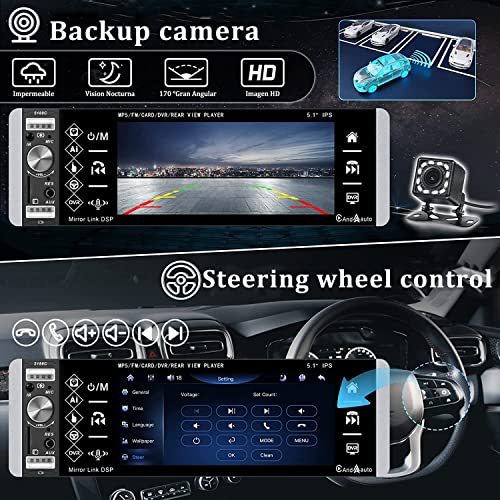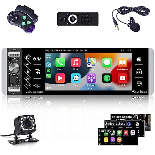 Camecho 1 DIN Carplay Autoradio Android Auto Autoradio 5,1 pollici Touch Screen Stereo Auto Bluetooth con Voice Assistant Mirror Link FM, USB TF AUX in, SWC Fast Charge Telecamera posteriore