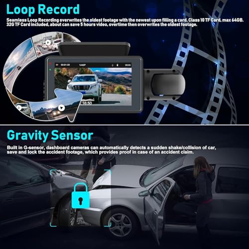 CAMECHO Doppia telecamera cruscotto anteriore interna con scheda TF da 64 GB Display IPS da 3" Telecamere da cruscotto per auto con visione notturna Registratore di guida Rilevamento del movimento