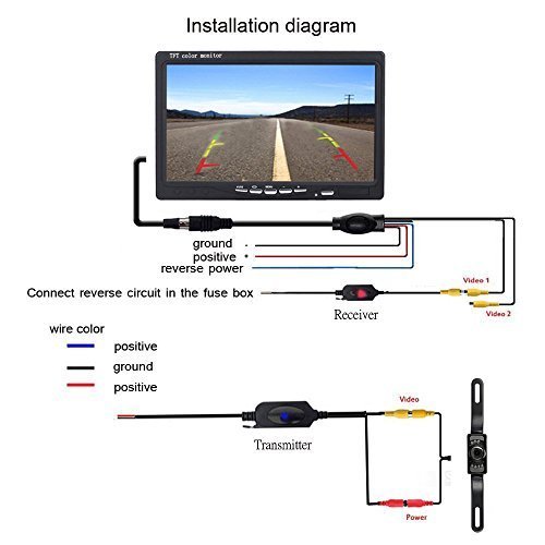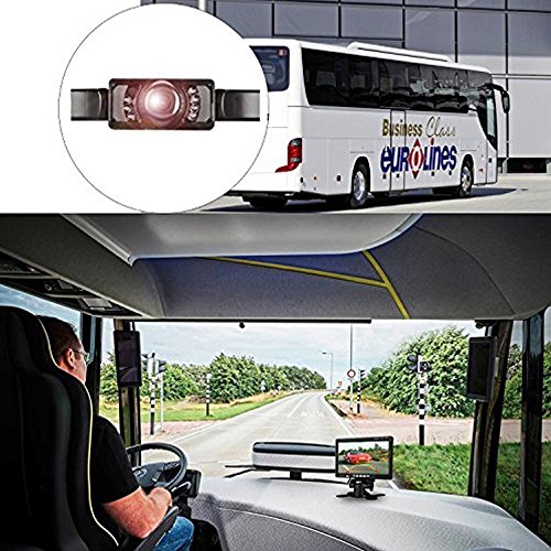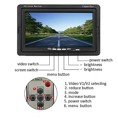 Schermo LCD a cristalli liquidi di 7 pollici: 2 canali di ingresso video selezionabili: V1 e V2. PAL e NTSC opzionali. Lo schermo si accende automaticamente e passa in modalità di telecamera posteriore quando effettui una retromarcia. Lo schermo può essere montato sul tettuccio o sul cruscotto in base alle tue necessità.