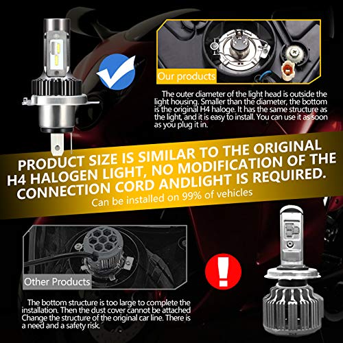 【Alta luminosità e risparmio energetico】Il faro LED H4 per moto è dotato di 4 chip Cree integrati ad alta potenza dell'ultima versione su entrambi i lati. Ogni lampadina LED produce una luce bianca allo xeno fino a 2600 lumen, che è il 220% più luminosa della lampada alogena normale e utilizza solo il 50% di energia rispetto alla lampadina originale dell'auto. Aggiornamento perfetto.