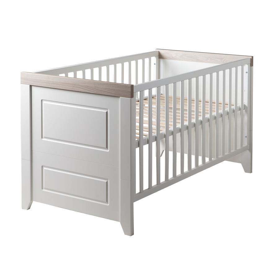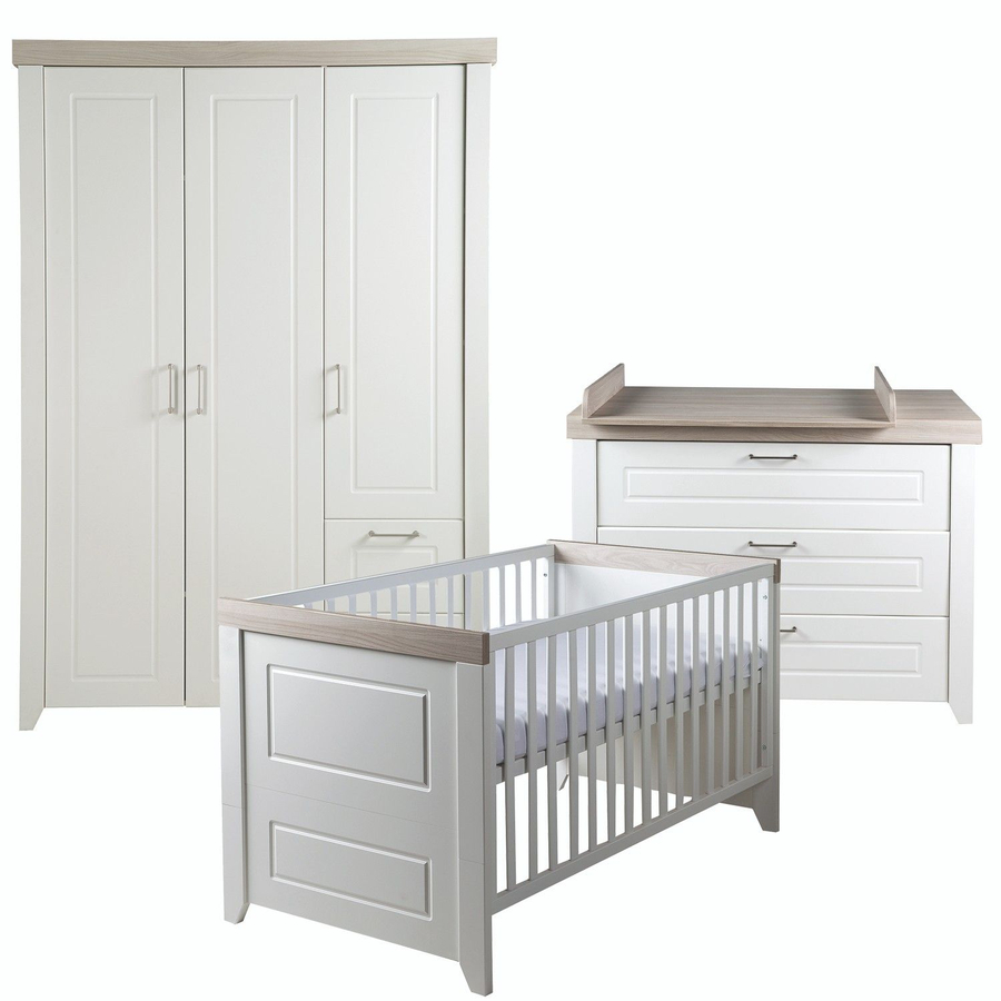 Elegante set cameretta per bambini, composto da lettino, ampio fasciatoio con 3 cassetti e armadio a 3 ante. Dettagli del prodotto: Culla Colore: bianco Materiale sbarre: Legno laminato Materiale testata: truciolato, rivestito in melamina Materiale sezione dei piedi: MDF, rivestito Superficie di sdraio: larghezza x lunghezza 70 x 140 cm Dimensioni: larghezza x lunghezza x altezza 76 x 144 x 82 cm Regolabile in altezza in 3 posizioni 3 pioli di scorrimento Può essere convertita in un lettino per bambini tramite i pannelli laterali (disponibili separatamente) Mobile fasciatoio Colore: bianco Materiale corpo: truciolato, rivestito in melamina Materiale fronti: MDF, rivestito Materiale pannello posteriore: HDF Materiale maniglie: Metallo Dimensioni senza fasciatoio: larghezza x profondità x altezza 120 x 42 x 98 cm Dimensioni con fasciatoio: larghezza x profondità x altezza 120 x 75 x 98 cm Altezza fasciaotio: 90 cm 3 cassetti Cassetto superiore con estrazione totale Il fasciatoio è rimovibile Armadio Colore: bianco Materiale corpo: truciolato, rivestito in melamina Materiale fronti: MDF, rivestito Materiale maniglie: Metallo Dimensioni: larghezza x profondità x altezza 138,5 x 52,5 x 199 cm 3 ante 2 cassetti 1 asta appendiabiti 5 ripiani Incluso nella consegna: Culla Rete a doghe Fasciatoio Cassettiera Armadio Attenzione: il materasso, i pannelli laterali e le decorazioni non sono inclusi.