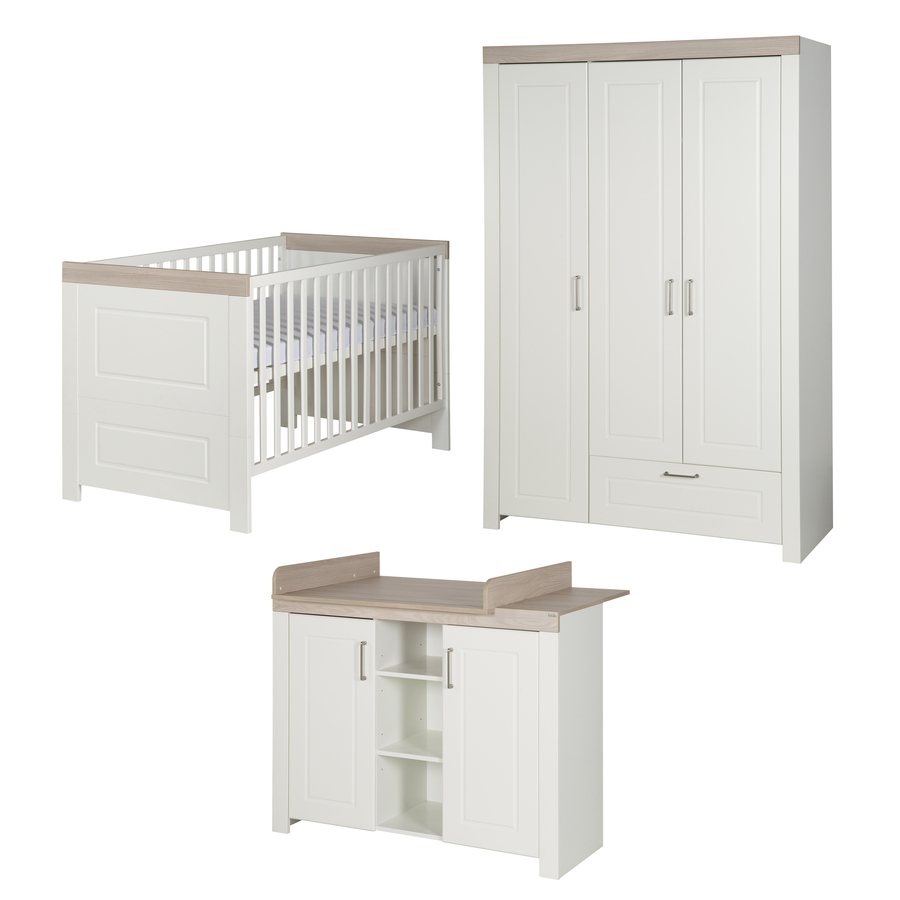 La cameretta Felix della marca roba colpisce per il suo design senza tempo Design in White e Luna Elm. Il set è composto da un lettino, un ampio fasciatoio e un armadio a 3 ante. Il lettino può essere trasformato in un letto Junior con sponde di conversione disponibili separatamente. Particolarmente comoda per sollevare il bambino dal letto è la posizione superiore del lettino regolabile in altezza di 3 livelli. Le tre barre estraibili permettono al bambino di entrare e uscire in sicurezza. Il fasciatoio con superficie per il cambio, con la sua comoda altezza di 90 cm, rende la cura del bambino un piacere per genitori e figli. Con tre ripiani centrali a vista, avrai tutto il necessario per la cura a portata di mano. Togliendo la superficie per il cambio, puoi usare il fasciatoio come normale cassettiera. L'armadio a 3 ante offre molto spazio grazie alla sua praticissima suddivisione con ripiani regolabili. Il cassetto con quattro ripiani e il ripiano sopra l'appendiabiti, mantengono l'ordine. Grazie alla sua altezza di quasi 2 m, l'armadio potrà essere usato a lungo. Il sistema di ammortizzazione dell'anta e l'estensione completa dell'ampio cassetto offrono un comfort speciale. La serie di mobili per bambini Felix è sviluppata in Germania e prodotta nell'UE. Dettagli del prodotto: Lettino Colore: bianco / naturale Materiale: truciolato, rivestito in melamina Superficie di sdraio: larghezza x lunghezza 70 x 140 cm Dimensioni: larghezza x lunghezza x altezza 76 x 143 x 82 cm Capacità di carico fino a 50 kg Regolabile in altezza 3 volte 3 altezze per la superficie di sdraio Trasformabile in letto Junior Fasciatoio Colore: bianco / naturale Materiale: truciolato, rivestito in melamina Materiale maniglie: metallo Superficie per il cambio: larghezza x profondità 85 x 75 cm Dimensioni senza superficie per il cambio: larghezza x profondità x altezza 117 x 42 x 100 cm Dimensioni con superficie per il cambio: larghezza x profondità x altezza 117,1 x 75 x 100 cm Altezza variab