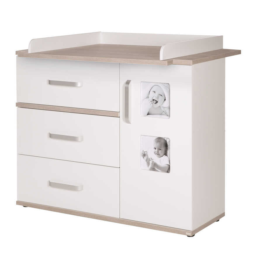 La cameretta Moritz in un bel bianco comprende un lettino, un ampio fasciatoio e un armadio a 3 ante. Dettagli del prodotto: Lettino Colore: Bianco Materiale corpo: truciolato, rivestito in melamina Materiale telaio a doghe e sponde laterali: Legno laminato Superficie di sdraio: 70 x 140 cm Dimensioni: larghezza x lunghezza x altezza 76 x 142 x 81 cm Telaio a doghe regolabile in altezza 3 volte 3 pioli rimuovibili La sezione della testa e quella dei piedi sono divisibili Fasciatoio Colore: bianco Materiale corpo + ripiani + unità di cambio: truciolato rivestito in melaminico Materiale pannello posteriore: HDF Dimensioni senza superficie per il cambio: larghezza x profondità x altezza 117 x 41 x 102 cm Dimensioni con superficie per il cambio: larghezza x profondità x altezza 117 x 78 x 102 cm Superficie per il cambio: 85 x 75 cm Altezza variabile: 94 cm 3 bordi di sicurezza 3 cassetti con funzione di chiusuraSoft-Close 1 porta con funzione di chiusura Soft-Close Bordi di protezione NBC Trasformabile in un fasciatoio Particolarità: 2 cornici integrate Armadio a 3 ante Colore: bianco Materiale corpo + ripiani: truciolato rivestito in melaminico, decor Materiale pannello posteriore: HDF Materiale maniglie: Metallo Dimensioni: larghezza x profondità x altezza 135 x 55 x 193 cm 3 porte con funzione di chiusura Soft-Close 2 cassetti con funzione di chiusura soft close 5 ripiani 1 appendiabiti Bordi di protezione NBC Particolarità: 3 x cornice integrata nell'anta del mobile Incluso nella consegna Lettino Fasciatoio largo 1 superficie per il cambio Armadio a 3 ante Attenzione: mensole, librerie, tavolino con sedia e varie decorazioni non sono incluse nella fornitura