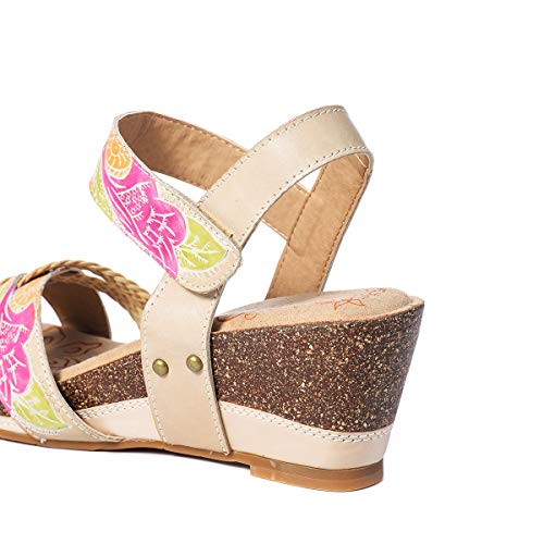 Chiusura in velcro per una totale sicurezza. Con sofisticate cuciture e comodo tacco a cuneo centrale. In combinazione con elementi etnici, chiaro e alla moda