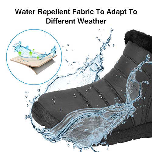 Resistente alla neve: il materiale superiore è realizzato in tessuto impermeabile e rivestimento sintetico in poliuretano, con cuciture sigillate e impermeabili, vi terrà comodamente asciutti durante tutto il giorno. L'interno con fodera in pelliccia sintetica fornisce un comfort di peluche, mentre la suola vulcanizzata impermeabile artigianale garantisce una trazione antiscivolo durante gli acquazzoni. Resistente idrorepellente.