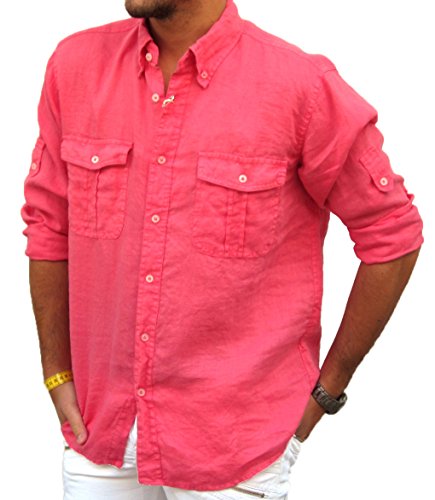 Camicia PURO LINO uomo casual doppio taschino ESTATE 2017 (XXL, Corallo)