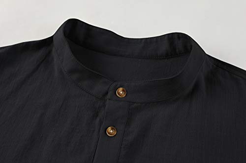 Camicia da uomo in cotone, a maniche corte, per il tempo libero, senza colletto, estiva Henley, Nero, XXL