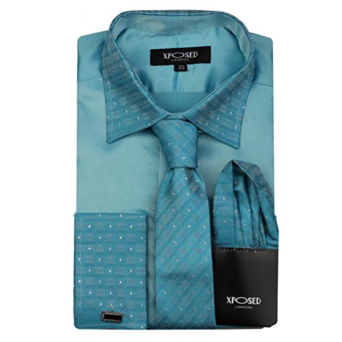 Set di camicia formale da uomo con colletto decorato in argento, simil raso, con cravatta, gemelli e fazzoletto, per abito da sposo - Blu - XX-Large
