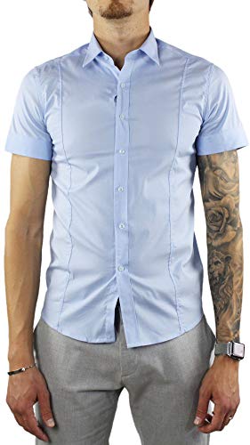 Camicia Uomo Manica Corta Slim Fit in Cotone Estiva Bianca Blu Celeste Nera (Celeste, XXXL)