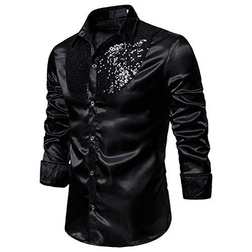 Camicia da Uomo a Manica Lunga con Risvolto di Lusso, Costume da Host per Smoking da Sera in Raso di Seta Simile a Una Camicia da Sera con Paillettes da Ballo (Nero, S)