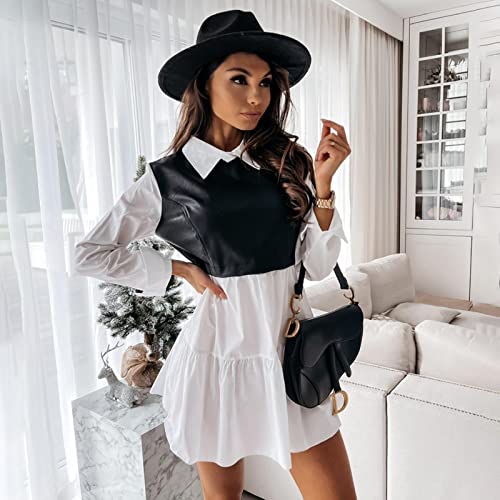 ZCVF Camicia Vestito Casual Ufficio in Ecopelle in Ecopelle in Cuoio Nero Patchwork Chic Moda Primavera Autunno a-Line Abiti increspati Abiti da Donna Abbigliamento
