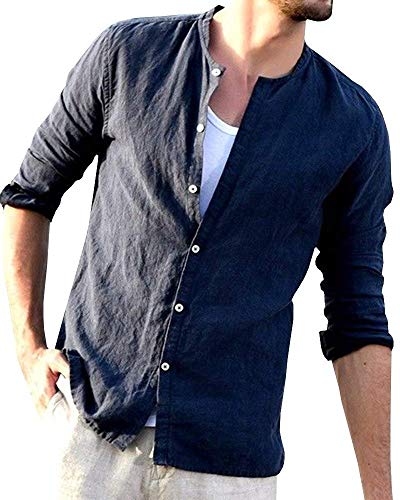 Camicie da Uomo Allentata Comode E Traspiranti Lino Maniche Lunghe Stile Slim Estivo Slim Grandad Collar Spiaggia Camicie Shirts Z Blu Large