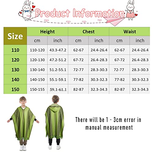 Dimensioni: questo costume per bambini ha 5 misure. Adatto per bambini di altezza compresa tra 110 e 150 cm. Poiché i vestiti sono molto larghi, i genitori possono facilmente scegliere la taglia giusta in base alla statura del bambino.