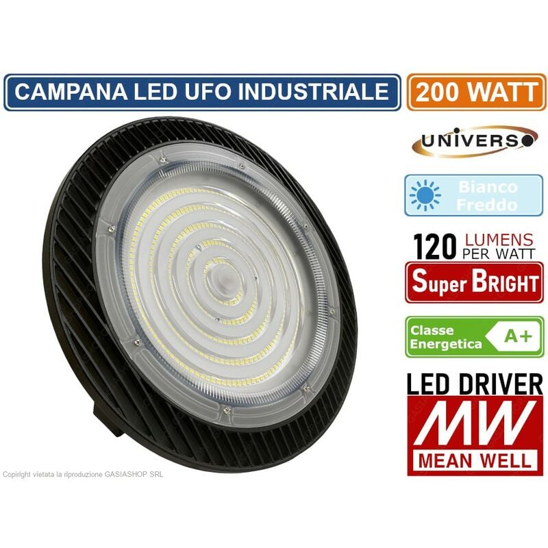 Lampada industriale LED High Bay mod. UFO-200F con potenza di 200W. Realizzata in alluminio di colore nero con copertura opaca. Forma Ufo Shape arrotondata piatta. Tecnologia LED SMD con fascio luminoso di 90° e flusso luminoso di 24000 lm. Questa lampada, ad alta luminosità, ha un rapporto di 120 lm/W . Grazie al grado di protezione IP65 può essere installata anche all'aperto. Incluso driver Mean Well (XLG-200-H-A) già collegato alla lampada. Cavi a saldare per la connessione all'impianto e gancio in ferro per poterla appendere. Questa lampada industriale è adatta per l'illuminazione interna di capannoni, reparti, depositi e locali . Una lunga vita e la facile installazione garantiscono bassi costi di manutenzione ed energia elettrica. Una lunga vita e la facile installazione garantiscono bassi costi di manutenzione e di energia elettrica. Disponibile con Luce Bianca Fredda 6500K . Dimensioni: Ø 399.8 x 190 mm.