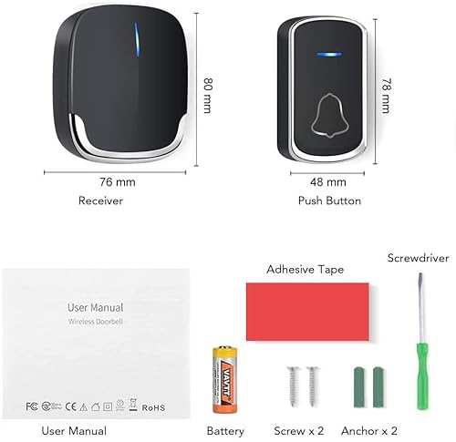 INDICATORE LED: Il campanello (trasmettitore) e ricevitori hanno indicatori LED, se qualcuno spinge il campanello, tutti i dispositivi lampeggiano con luce blu. 58 suonerie disponibile, 5 volume regolabile da 0 dB a 110 dB.