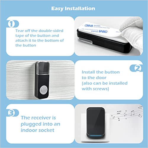 【IP44 impermeabile e facile da installare】: funziona bene sia in condizioni di bagnato che di asciutto. Nessun problema per l'installazione all'esterno, basta collegare i ricevitori a una presa di corrente, i pulsanti possono essere fissati al telaio della porta con viti o fissati con nastri biadesivi.