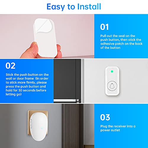 Facile da installare: collegare il ricevitore con i flash LED a una presa di corrente. Fissare il pulsante alla parete o al telaio della porta con toppa adesiva o viti