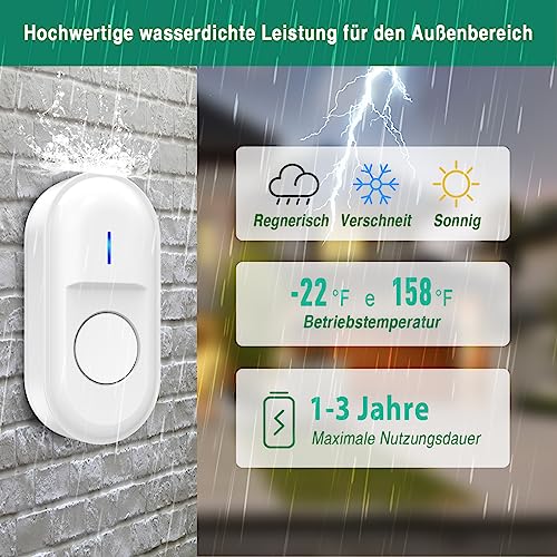 【IP55 Impermeabile】Il trasmettitore di campanello senza fili da esterno è resistente alle gocce di pioggia acqua, la classificazione impermeabile e antipolvere IP55 assicura una perfetta performance all'aperto, resiste a condizioni climatiche difficili