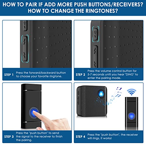 Campanello Senza Fili, Campanello senza fili Impermeabile con Raggio d'Azione di 200m 58 Suonerie 5 Volume Regolabile, 1 Trasmettitore e 1 Ricevitore per Casa, Negozio, Ufficio