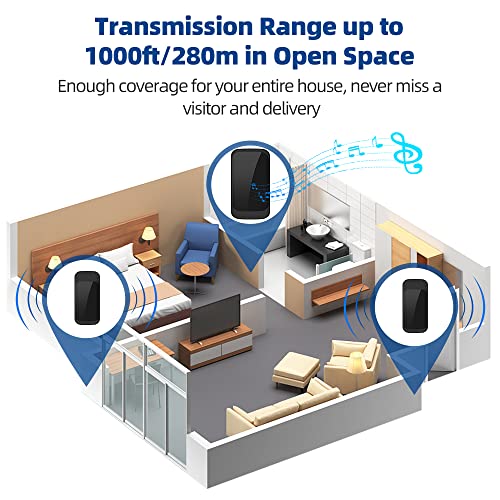 【Raggio Wireless 280 M/1000 Piedi e 2 Pulsanti a Sfioramento】 Il raggio ultra lungo di questo campanello è fino a 280 m/1000 piedi nell'area aperta tra trasmettitore e ricevitore. I 2 pulsanti a sfioramento che supportano 2 diverse melodie regolabili sono utili per distinguere i visitatori dalla porta anteriore o posteriore. Con gli altoparlanti a volume controllabile, non ti perderai un visitatore o una consegna, anche se ti trovi in poche stanze o su un piano diverso.