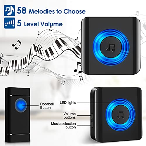 58 SUONERIE E 5 LIVELLI DI VOLUME - Con selettore su ogni porta, campanello radio impermeabile all'esterno per scegliere il tuo tono preferito tra 58 diverse melodie meravigliose. Inoltre, il volume può essere impostato su 5 livelli.