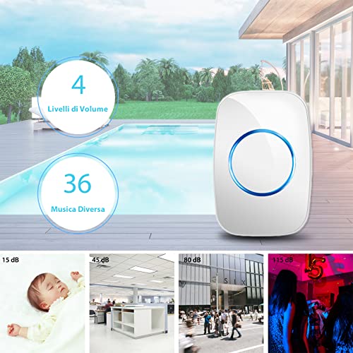 [4 regolazione del volume e 36 brani selezionabili] Questo segnale acustico wireless è un tono di chiamata forte, il volume può essere regolato in 4 fasi e la gamma variabile del volume è compresa tra 15 dB e 115 dB. È possibile selezionare 36 brani per soddisfare un'ampia varietà di ambienti ed esigenze, consigliati per persone con problemi di udito e rumorosi