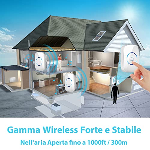 Campanello SOS Wireless Chime Impermeabile, Campanello Tascabile e Portata Wireless 300M, 36 Melodie Selezionabili e 4 Livelli di Volume, per Anziani o Disabili, Donne Incinte, 2 Ricevitori